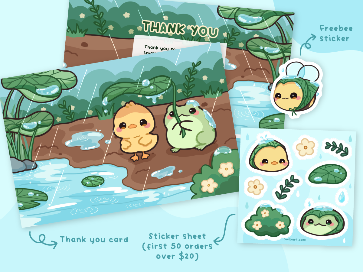 Enjoy a cute freebee sticker + thank you card in every order, and an extra sticker sheet for the first 50 orders over $20 💌