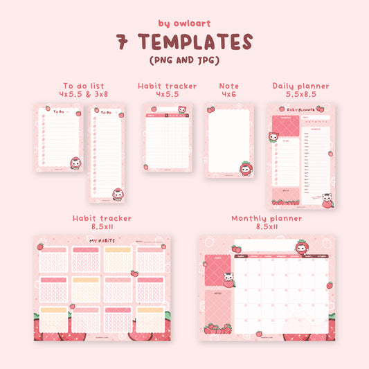 Strawberry Kitty Planner Stationery Bundle Digital Download (7 templates)