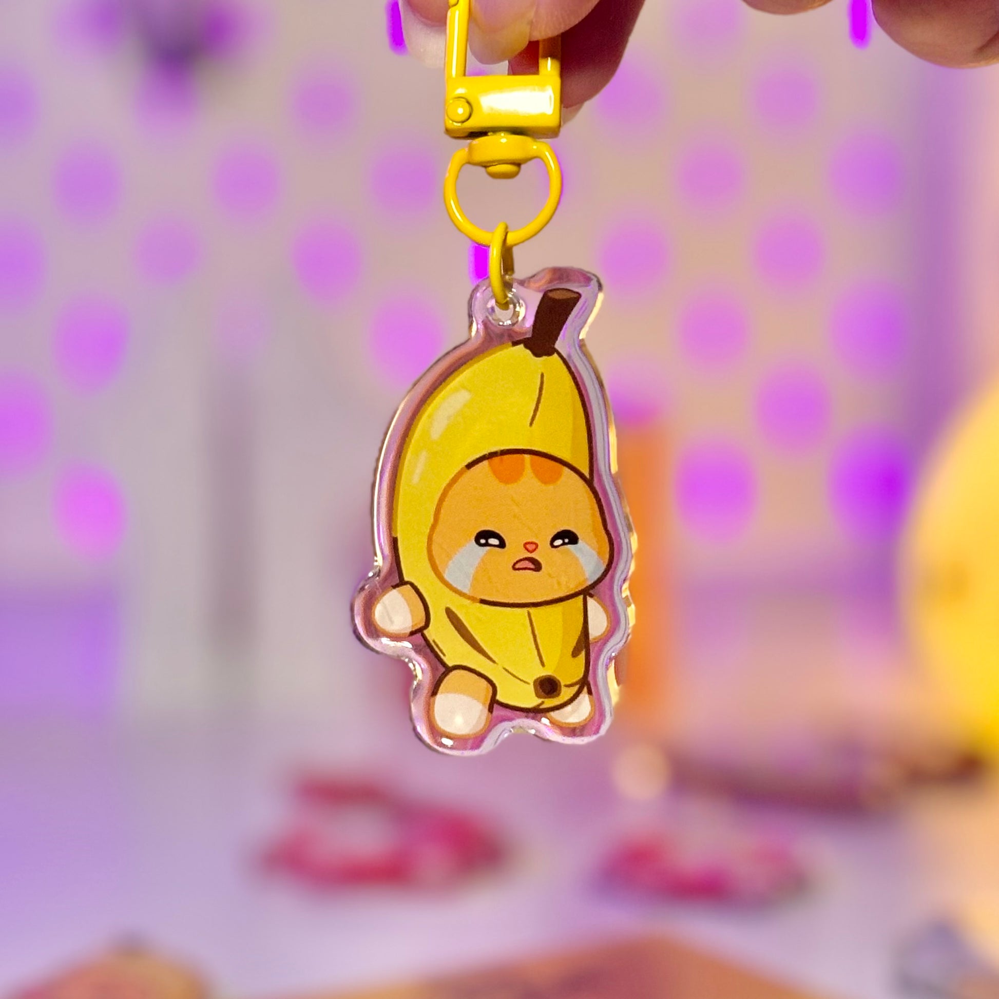 Meet Reese, the orange cat who’s now a banana—and not too happy about it! This double-sided acrylic keychain features the quirky Banana Cat design, with a cute banana cat on the front and a tearful expression on the back, inspired by the popular Banana Cat meme. Perfect for meme lovers and cat fans alike!