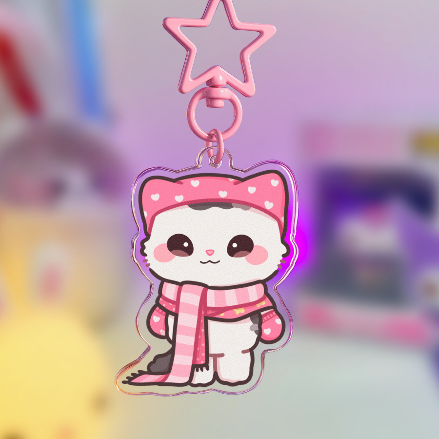 Take cozy Remi on the go! Snuggled in her scarves, this adorable acrylic keychain is a must-have for anyone who loves cute and cuddly winter aesthetics.