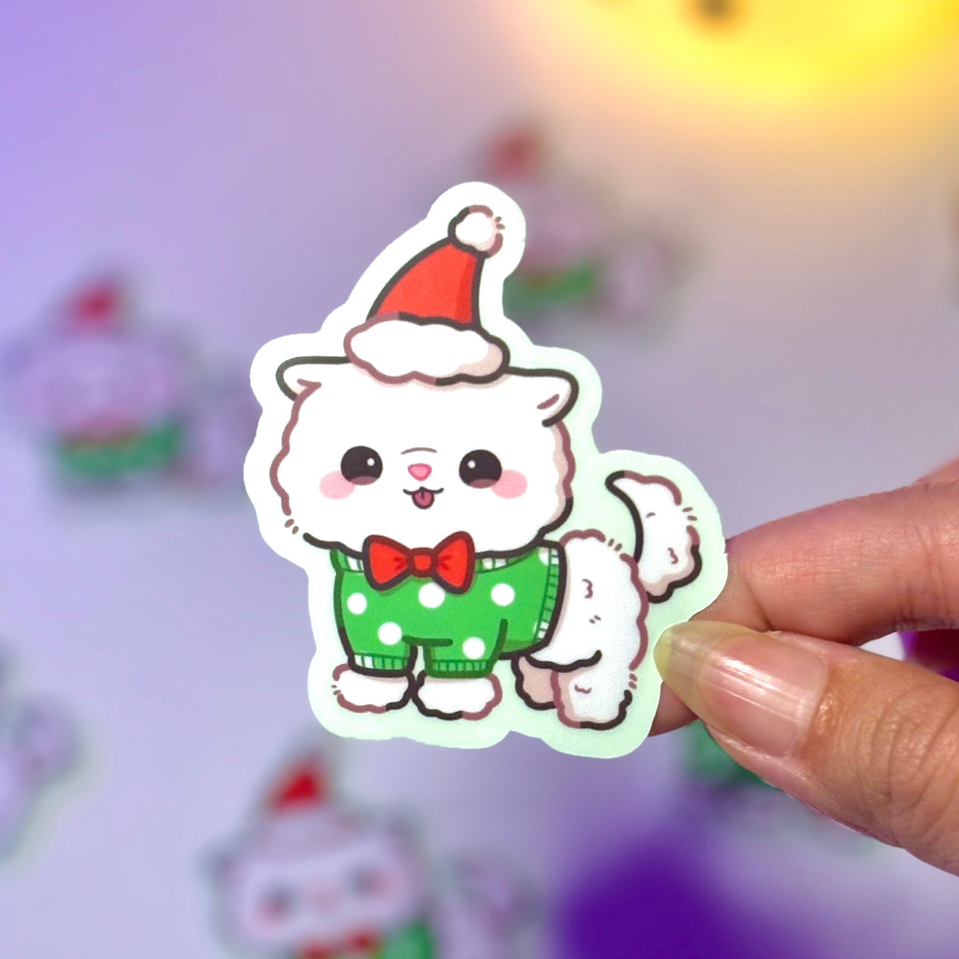 Fluffy Puppy in Holiday Sweater Waterproof Sticker