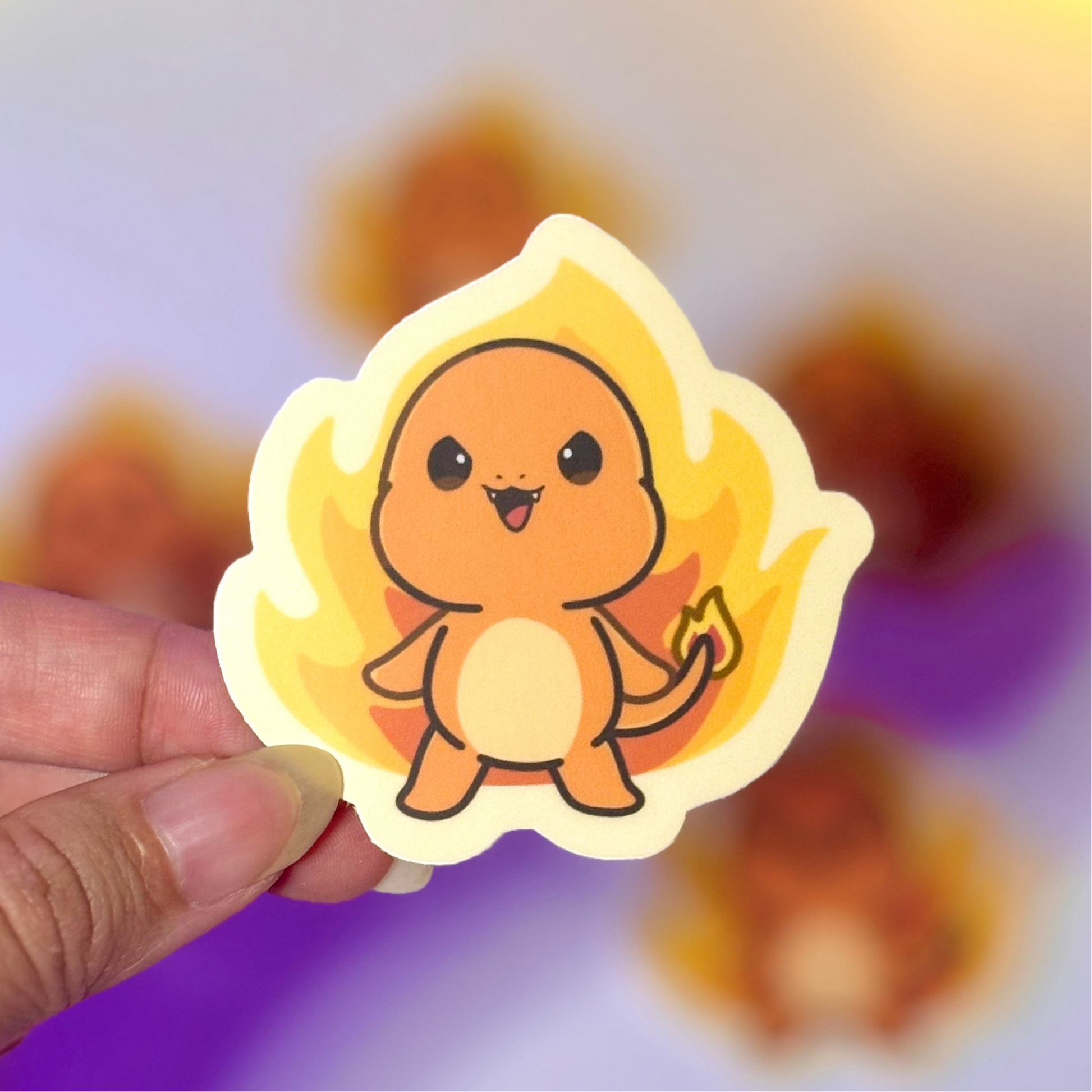 Get ready for some fiery fun with this cheeky fire-type lizard laughing in front of a backdrop of flames! This waterproof sticker is ideal for adding a little mischievous spirit to your favorite accessories.