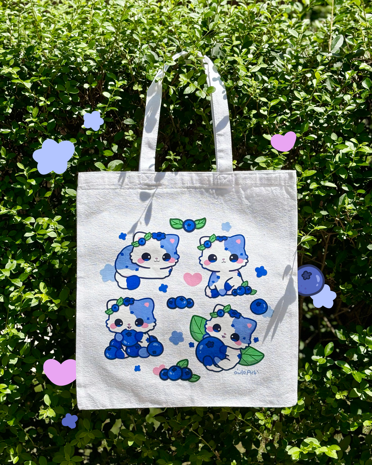 A dreamy white cat relaxing in a pile of blueberries makes this blueberry cat tote irresistibly cute. With soft blue tones and cozy vibes, it’s a great aesthetic tote bag for everyday errands, library trips, or grocery runs.