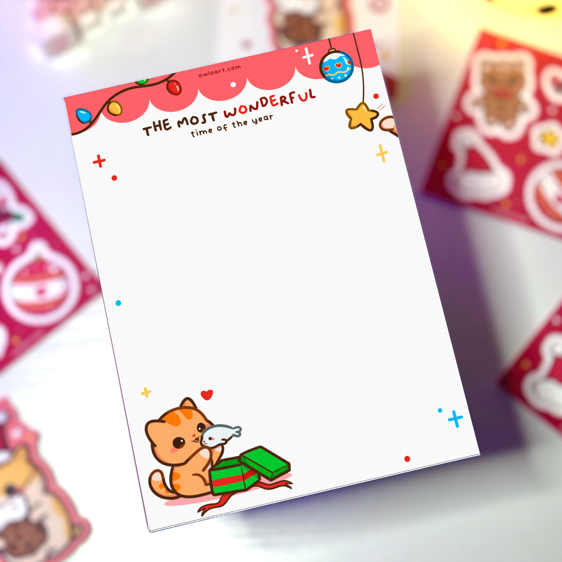Bring joy to your notes with the Most Wonderful Time Notepad! This design features Reese, the playful orange cat, excitedly opening his holiday present. Perfect for jotting down festive plans, shopping lists, or reminders.