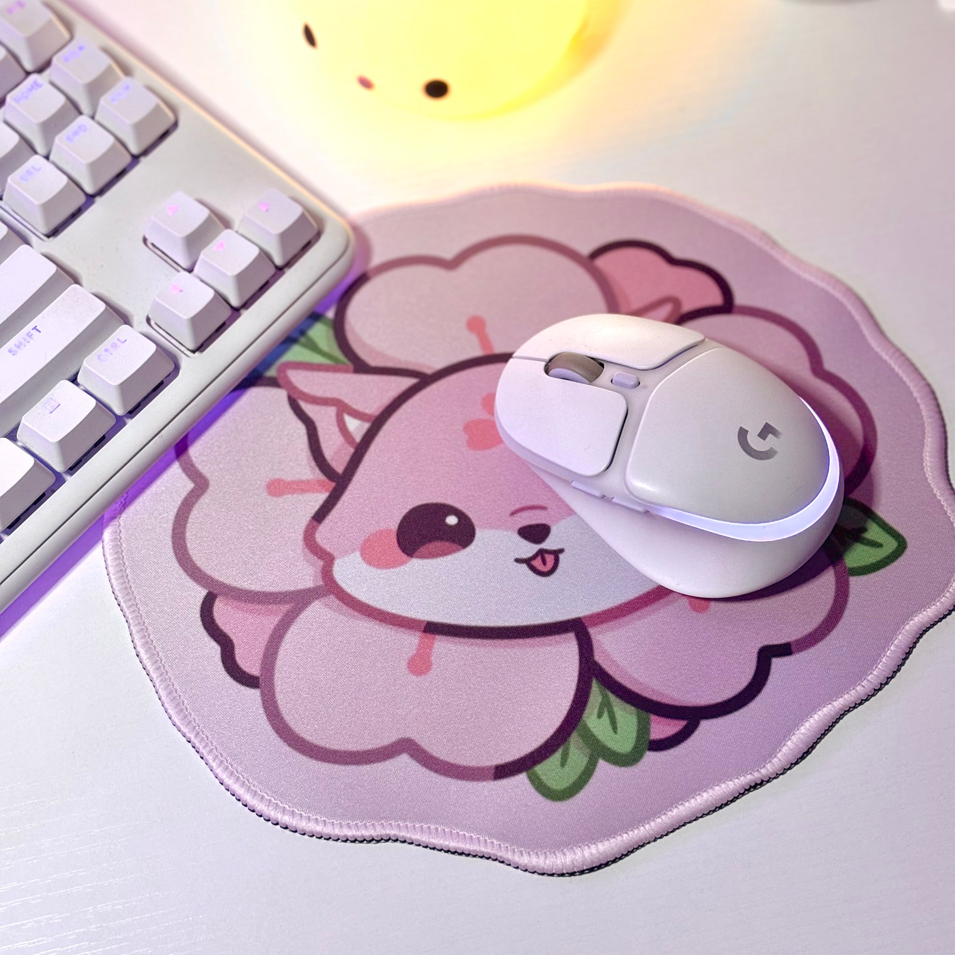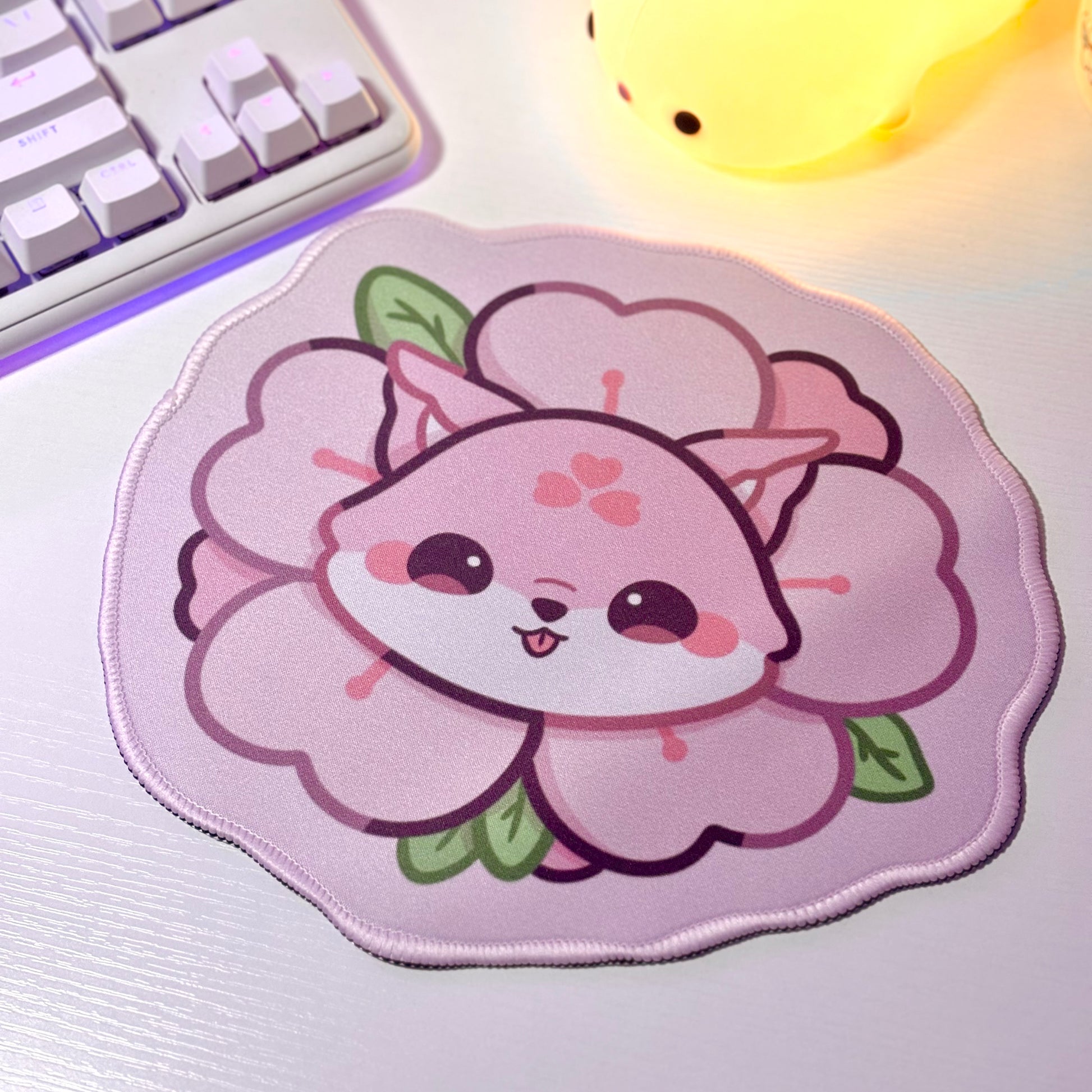 Let Sakura Fox keep you company while you work or play! This die-cut mousepad features the adorable fox at the heart of a blooming cherry blossom, bringing a splash of pink and playful energy to your desk.